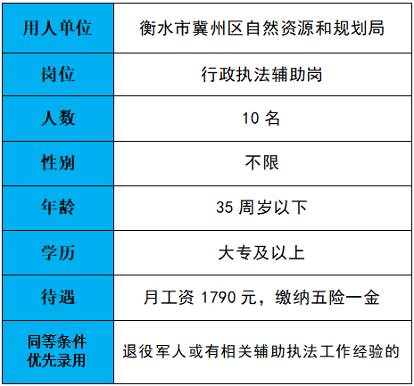 衡水天翔勞務(wù)派遣有限公司接受衡水市冀州區(qū)自然資源和規(guī)劃局的委托,結(jié)合實際用人需求,面向社會公開招聘10名行政執(zhí)法輔助人員。具體招聘事宜如下: